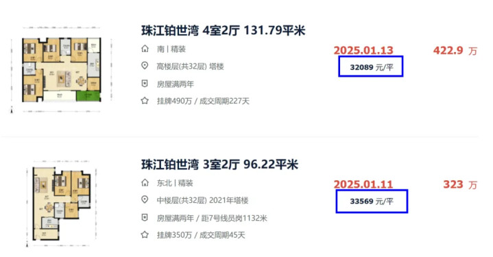 新房中,2公里外的珠江铂世湾二手房成交价也是频频下跌,最新成交价为3.2万/㎡,与当年冲上5万/㎡的房价比,业主都在割肉卖。