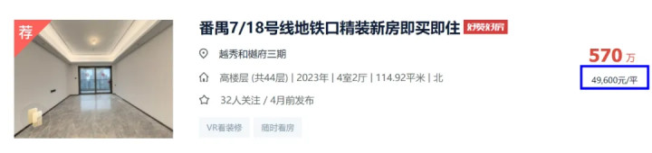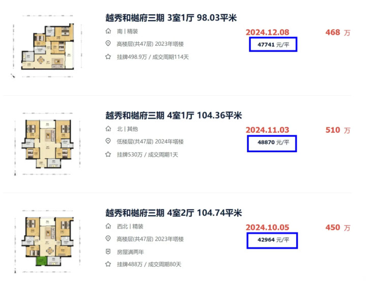 贝壳在售的越秀和樾府三期中,有一套115㎡北向四房,挂牌4.96万/㎡,挂牌4个月仍未卖出。对比成交历史,这套房源价格明显是高了。