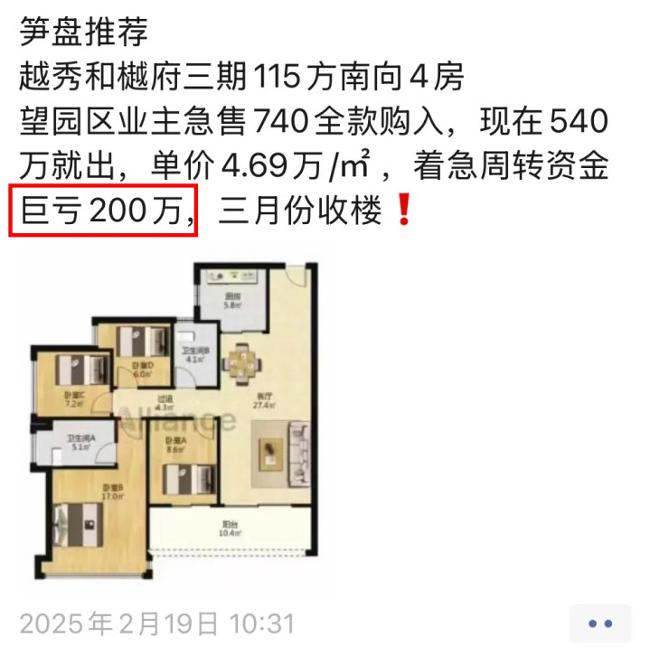 越秀和樾府三期一套115㎡南向四房,原全款740万购入,现540万卖,折算单价4.69万/㎡,巨亏200万。