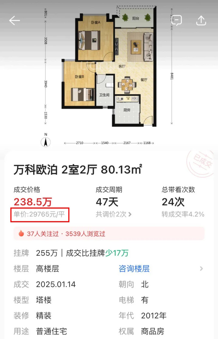 当年,万博“头牌”二手房——万科欧泊就是典型代表,成交价一度达到5万/㎡,现在竟然跌破3字头。万科欧泊在2025年1月成交了一套80㎡北向两房,总价238.5万,单价2.97万/㎡,接近万科欧泊近年来二手房最低成交价2.7万/㎡。
