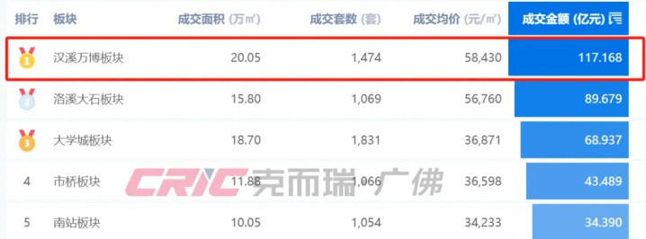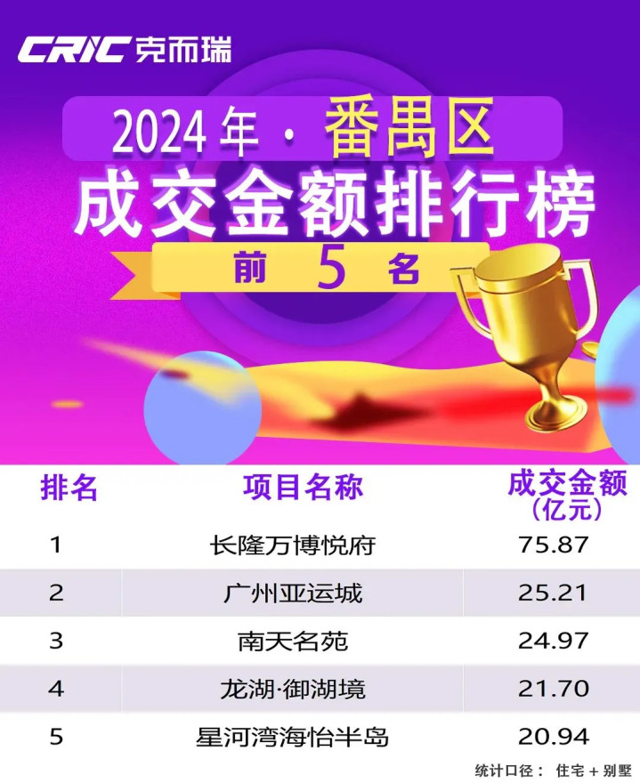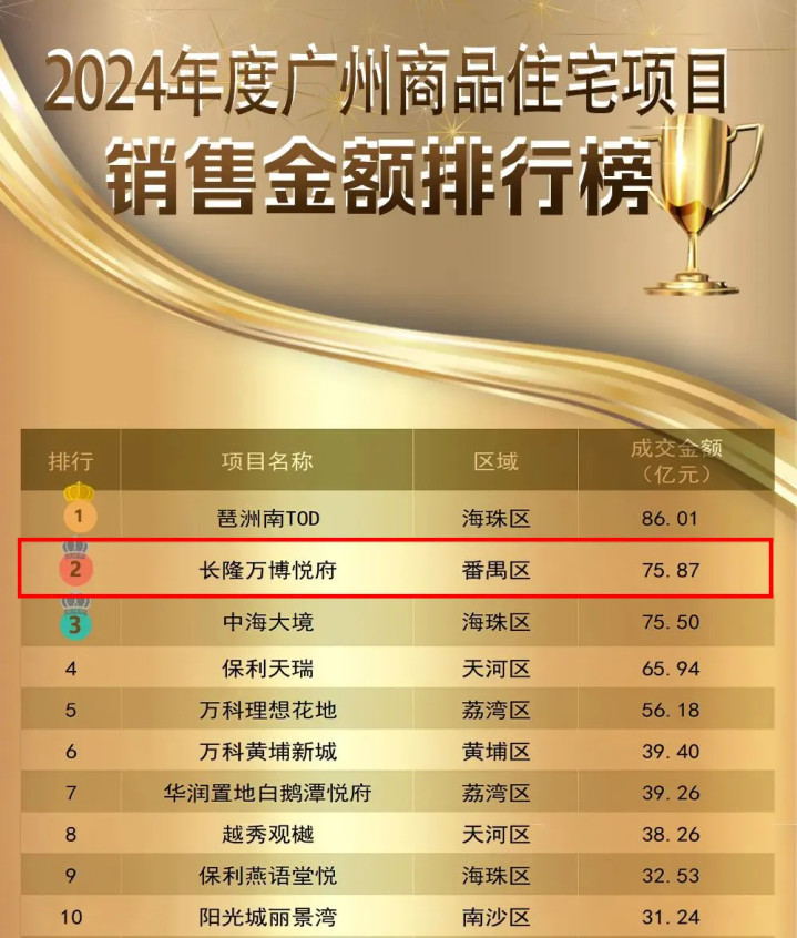 长隆万博悦府在2024年番禺区成交金额排行榜中排名第一,甩开第二名亚运城几个身位,相当于亚运城年度成交金额的3倍。