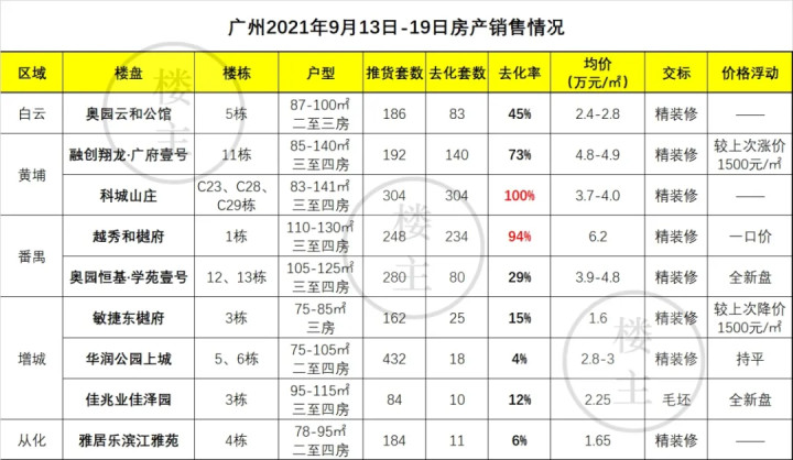 在低迷的市场中,长隆万博悦府依旧表现突出,这主要得益于其引入的教育资源。这个市场并不缺客户,缺的是“懂买家需求”的项目。楼主找到一张2021年9月中旬广州房产销售情况,越秀和樾府三期加推去化率高达94%,跟增城、从化个位数的去化率形成鲜明对比。你说,当年是客户少了,还是项目多了?